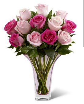 A vase arrangement of 6 light pink and 6 dark pink roses with some greens