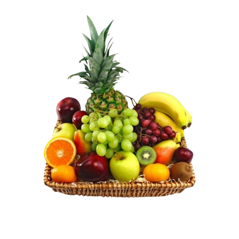 A basket of mixed fruits: Pineapple, grapes, banana, orange, kiwi, pears, and apples.