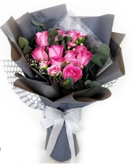 a lovely bouquet of 10 long stem fuschia pink rose with greens and fillers
