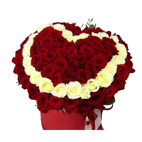 50 stems red roses and 30 stems of white imported roses in a round box.