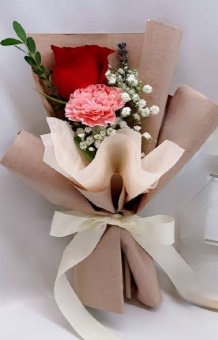A bouquet of 1 Stem red rose and single stem pink carnatuion with greens and fillers