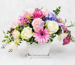 A vase arrangement of mixed flowers that includesx roses, carnation and gerberas with greens and fillers