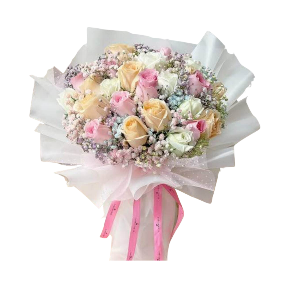 24 stems of imported pink, yellow, and white roses in a bouquet.