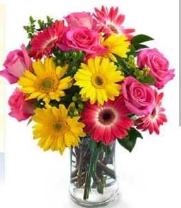 A vase arrangement of 6 pink roses, 5 yellow gerbera abd 5 red gerbera with some greens