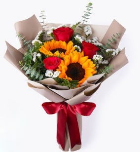 A bouquet of 3 red roses and 2 sunflower with greens and fillers