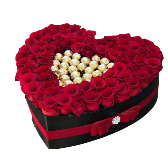 100 stems red roses with 30 pieces of ferrero rocher in a heart shaped box.