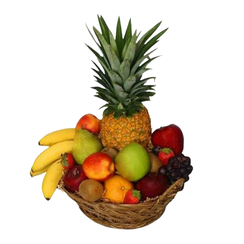 A basket of mixed fruits: Pineapple, grapes, orange, strawberry, kiwi, pears, and apples.